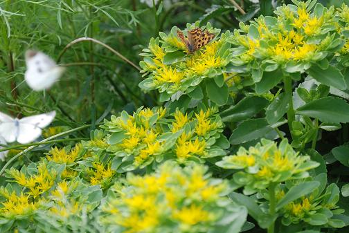 | コメント | ベンケイソウ科のキリンソウ[暫定]です。 星形5弁の黄色の花が咲いています。 この科の名前の分類は大変難しく、ネット検索しても特徴がはっきりと掴めません。 画像は、高地ではなく、標高数百メートルの河川敷で見かけたものです。 花全体では、40〜50cmぐらいの大きなものでした。 吸蜜している蝶の画像を見ても、その大きさが想像できます。 尚、追加画像の3枚目は入笠山の花畑で撮ったものです。 |