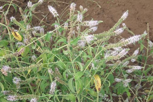 | コメント | 日本のハッカのことをミント、西洋ハッカのことをペパーミントと呼んでいるようですが、交雑種などもあり、 区別は良く解りません。 共通した特徴で、葉っぱの周辺にに凹凸があり、香りが強く、ハーブの代表的な存在です。 蝶などの昆虫が多数集まってきます。 ニホンハッカの花は、茎の途中に放射状に咲いている。 一方セイヨウハッカの花は、穂のようになって主に茎の先端に多く咲いている。 また、セイヨウハッカの葉は表面のシワシワが多い。 |