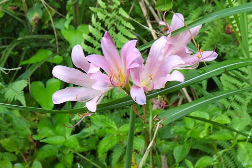 | コメント | ヒガンバナ科のナツズイセン。 夏に人里近くの草地に、ピンク色の花を咲かせる。 葉と球根がスイセンに似ていると言うが、花はスイセンには似ていない。 |
