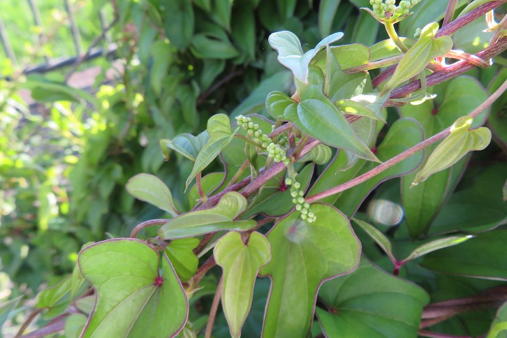 | コメント | ヤマノイモ科のナガイモ。 名前の通り、地下茎の長い芋が食用になる。 茎や葉脈が紫色。 葉は成長とともに、互生(6月頃)から対生(8月頃)に変わります。ややこしいですね。 食用として栽培されており、道路脇のフェンスなどに逃げ出しているのをしばしば見かける。 |
