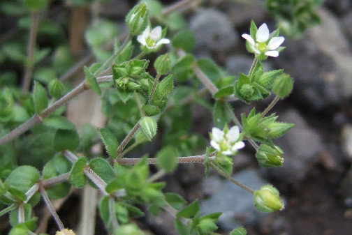 | コメント | コンクリートで舗装した隙間でも、どこにでも生える。 大変丈夫な雑草です。 花は数mmの小さな5弁ですが、近くで見ると意外にきれいな花です。 茎は枝分かれして元気そのものです。 良く似たハコベも5弁ですが、ハコベは花びらの先端が 分かれて、10弁のように見える。 良く似たものに、ノミノフスマもあり、こちらも5弁が10弁のように見える。 |