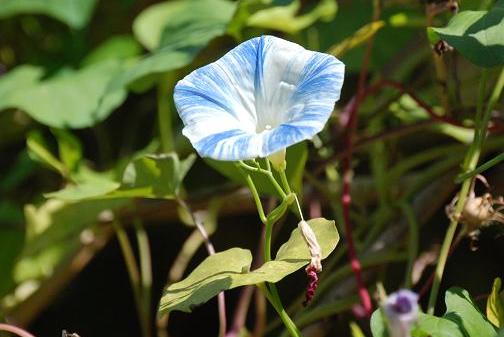 | コメント | 西洋朝顔の一つで、「空飛ぶ円盤」という意味らしい。 性質は、ヘブンリーブルー(天上の青)と良く似ているが、花色は 青と白が縞模様に混じっている。 フライングソーサーはヘブンリーブルーとパーリーゲートを交配させたものと言う情報も あります。 |