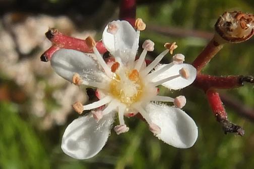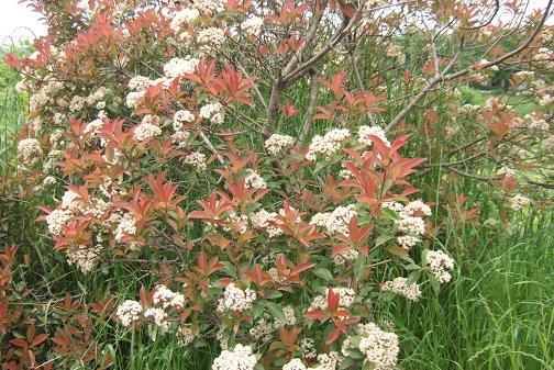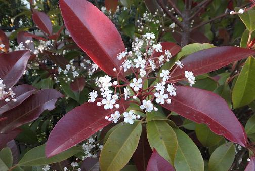 | コメント | 公園や遊歩道など垣根として良く植えられている小木。 若い芽(葉)は、紅色をしている変わった木です。 春の新芽の葉が赤く、やがて緑色に変化し普通の木に見えます。 全ての木で花が咲くわけではなく、花が咲いた木をたまに見かけます。 花は小さくて白い花が集まっている。 一つの花は5弁ですが、密集していて解りにくい。 |