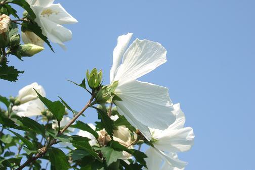 | コメント | 7月から9月頃までの長期間、道路脇や民家の庭先で多数見られます。 花は、白・ピンク色・紫色などがあり、更に花弁が一重と八重があるので、 種類が多彩な感じがします。 夏休みの高速道を走行時に交通渋滞にはまることが良くあり、 道路脇にきれいなムクゲの花があると、疲れを癒してくれます。 先ずは、葉を見て「フヨウとムクゲ」を区別しましょう。 五角形のような葉ならフヨウ、多少櫛歯になっているが尖っておればムクゲ。 |