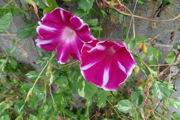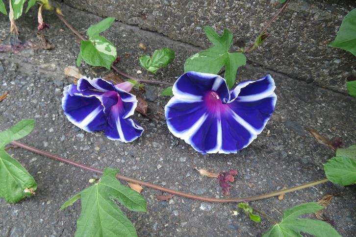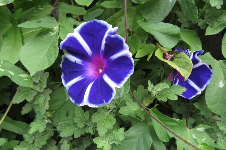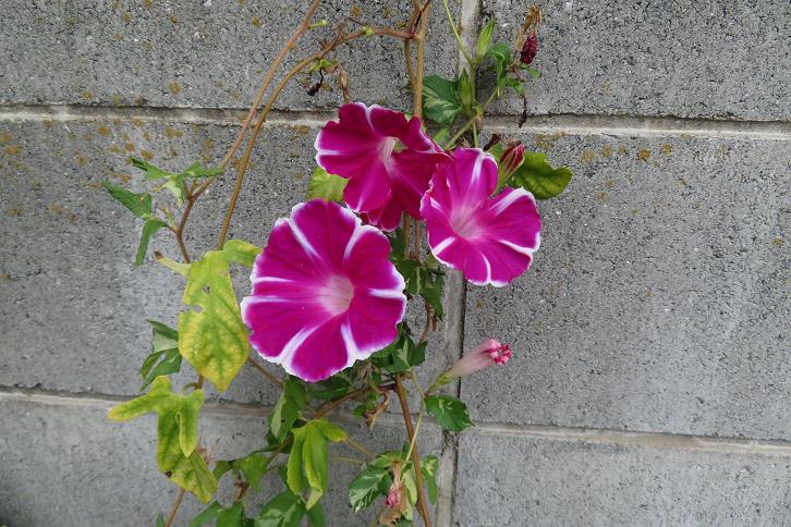 | コメント | 日本で作り出された朝顔の一つ、ヨウジロアサガオ(曜白朝顔)。 日本の朝顔とアフリカ系の朝顔(マルバアサガオ ? )などを交雑して、日本(静岡県)で作られたとされている。 花の中心から外に向かって、6本の白い筋(5本というのも見かける)があります。 花色は、赤と濃い青色のものを見かけます。 葉は、3裂、5裂または7裂に深く別れています。 園芸種なので野生で見かけることはなく、民家の庭先、塀などで咲いています。 |