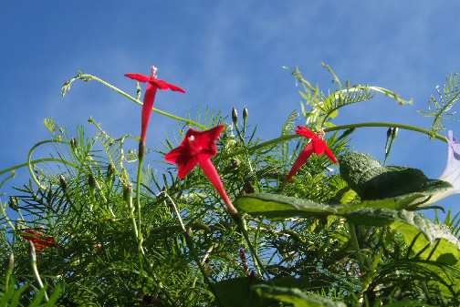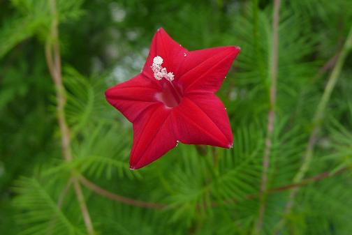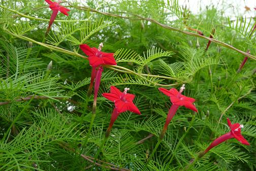| コメント | 真っ赤な直径2cmにも満たない小さな星形の花です。 私はまだ出会っていませんが、白い花もあるそうです。 蔓性で、金網フェンスなどに絡まって、元気よく咲いています。 ルコウソウの葉は細く、別種にマルバルコウソウがあります。 |